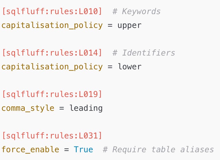 These are rather simple and standard SQL style guide instructions that can be implemented by a linter, but I was curious to see Code Review in actions.