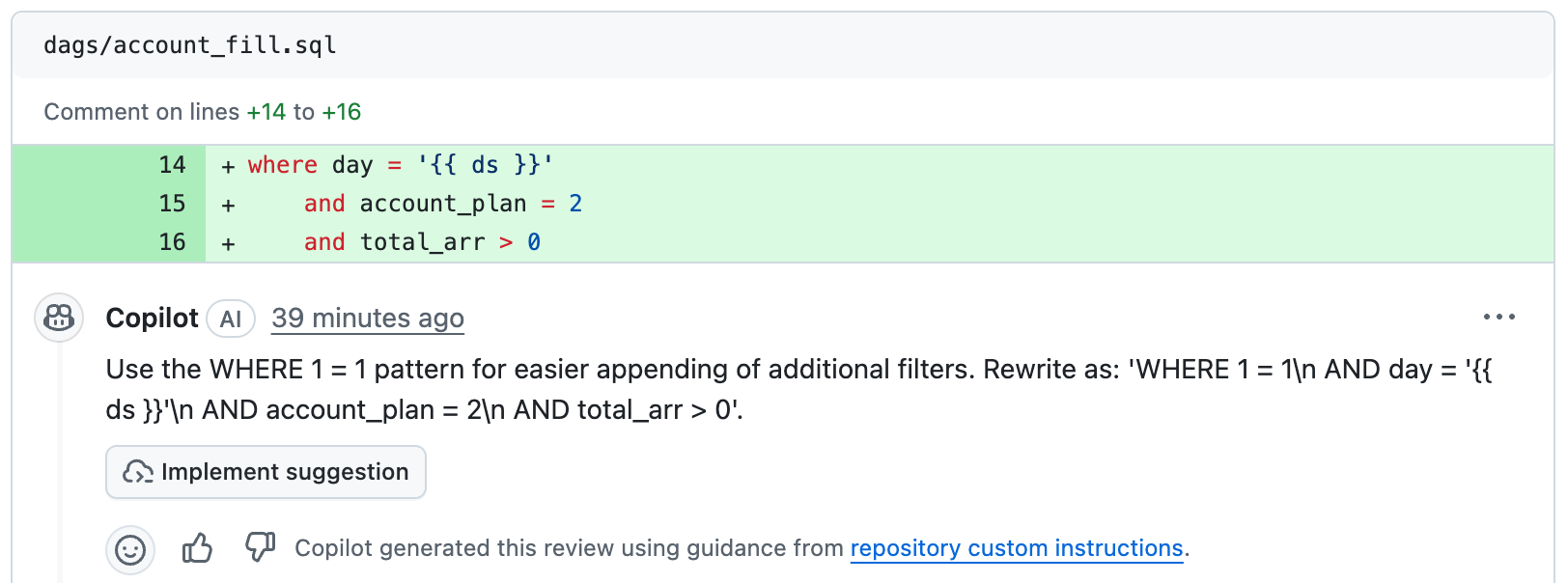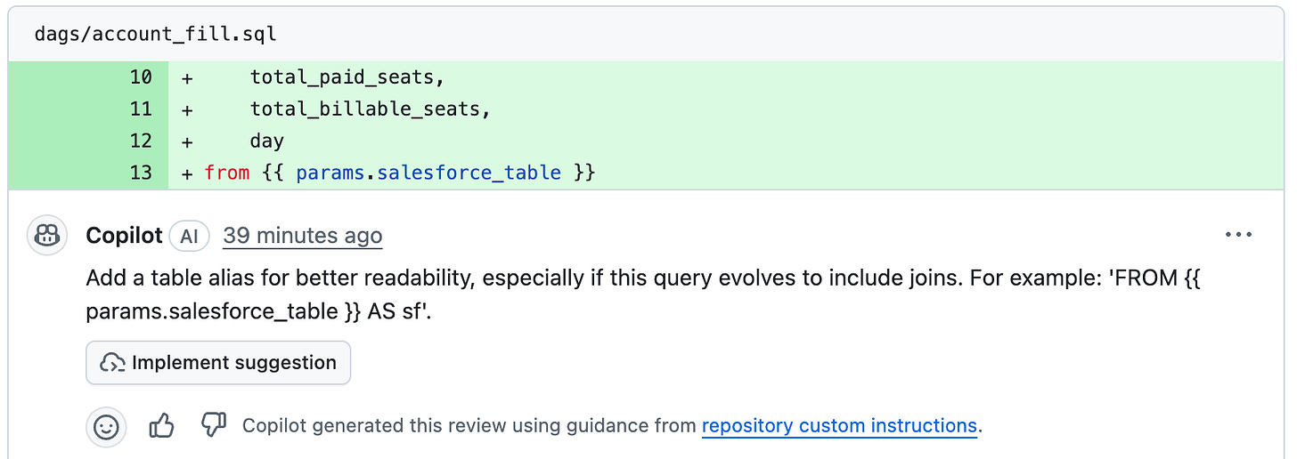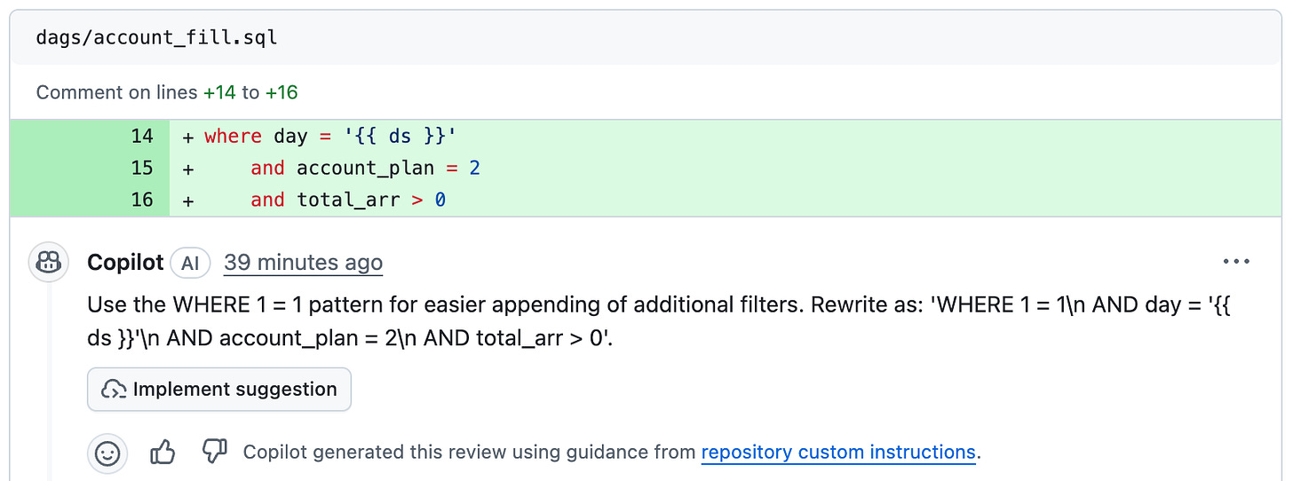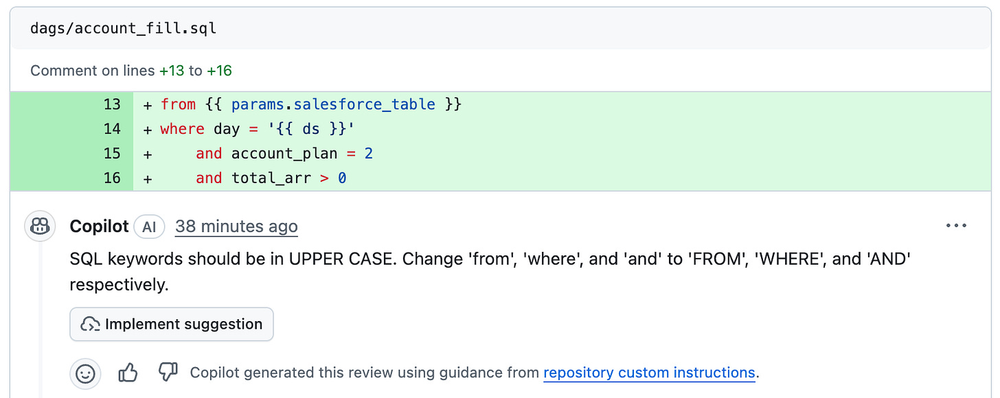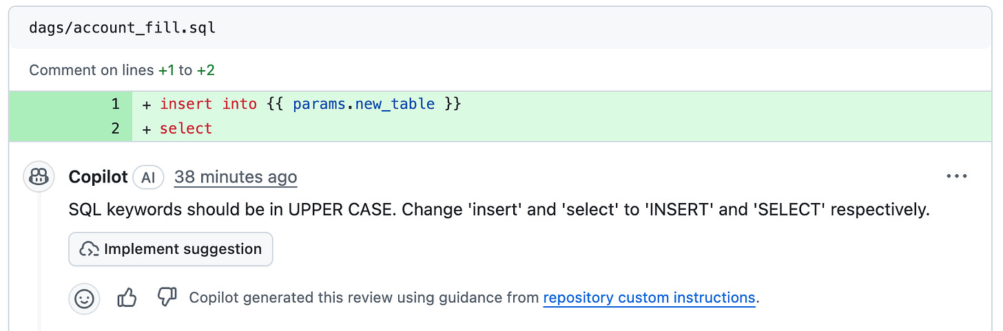 The first two refers to the usage of lower case in SQL statements, the third one is about the missing alias, and the fourth is about the preferred style for WHERE clauses. It’s interesting how Code Review confirms that it’s using the repo custom instructions, and it offers to implement the suggestion.