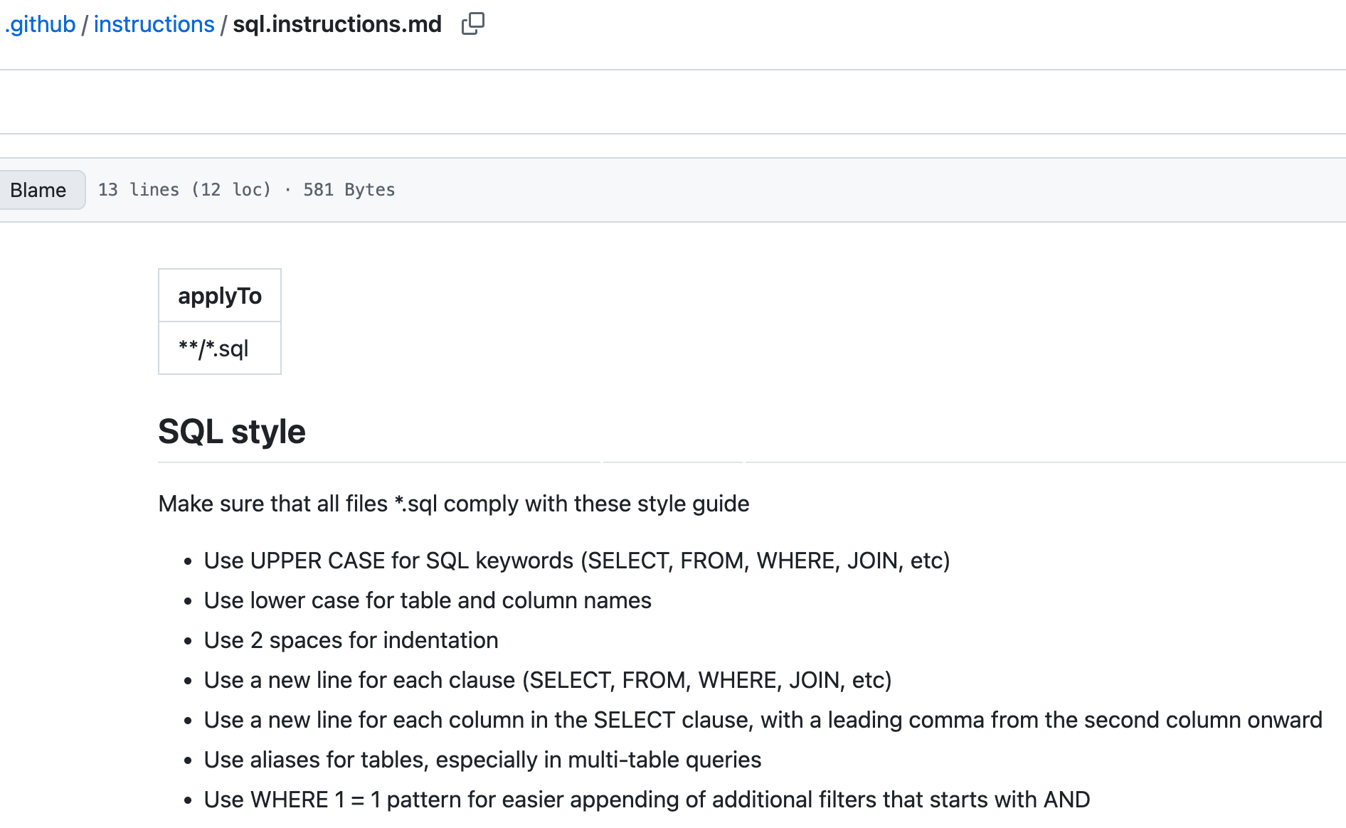 In my case, I created some simple SQL style guide instructions in a markdown file (.github/instructions/sql.instructions.md) that apply to any SQL file anywhere in the repo